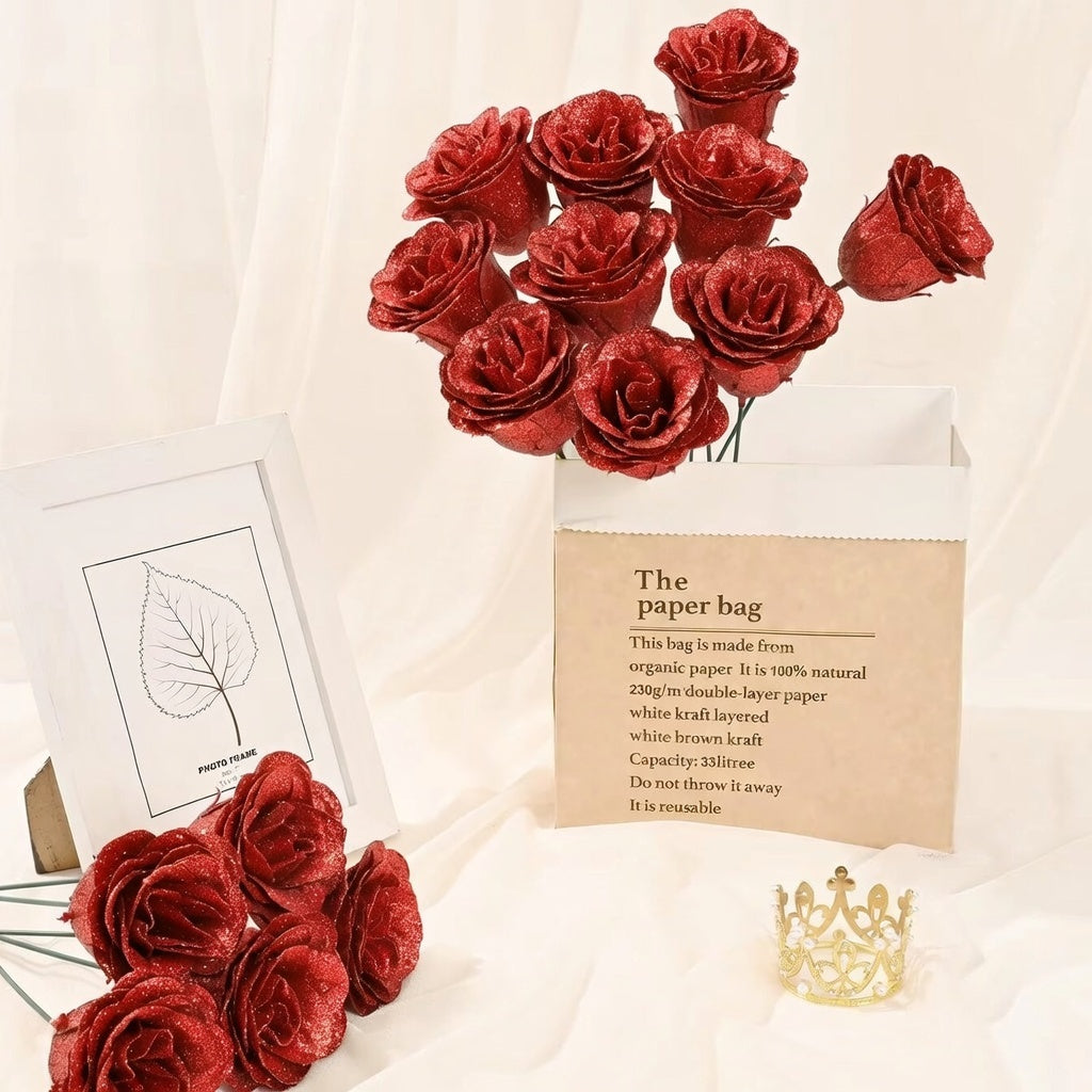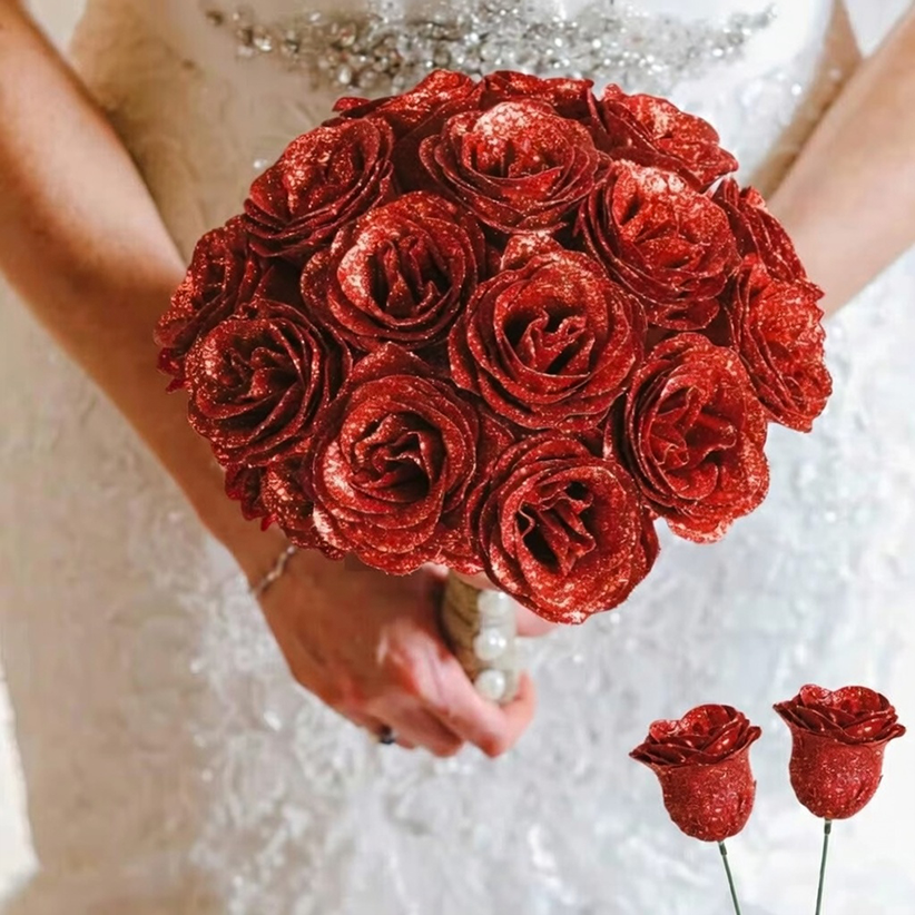 No. The roses are finished with a secure glitter coating that won’t shed under normal use.